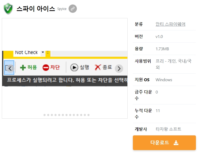 * 바이러스 백신은 동작 특성상 신종/변종 바이러스는 탐지가 안될 수 있지만, SpyIce는 원천적으로 실행 차단하므로 백신의 보안 대비책으로 사용할 수 있습니다.